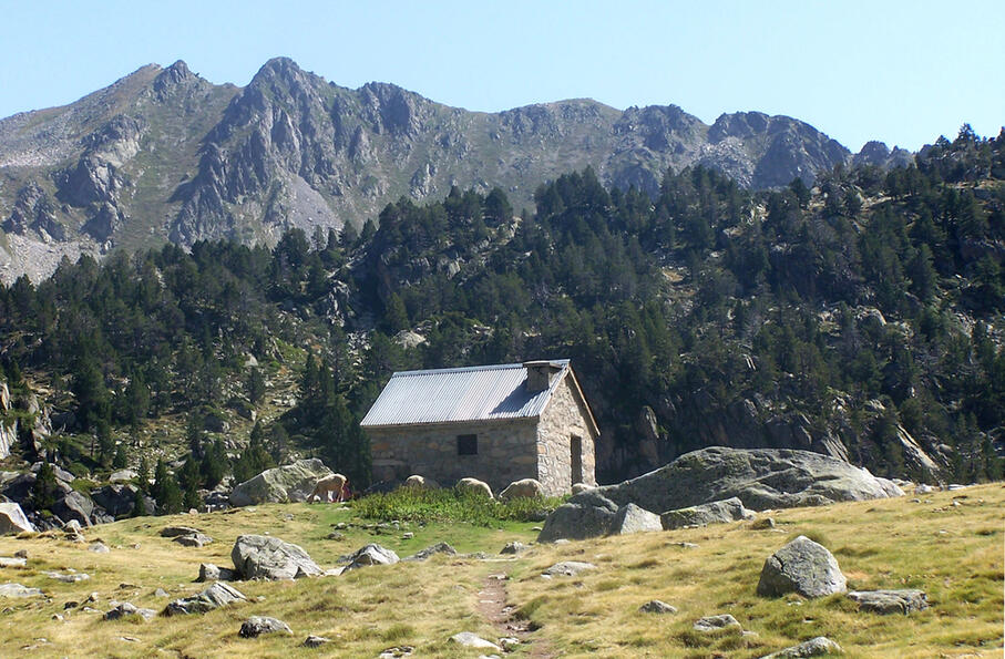 Traverser la route et prendre, 50 m plus loin, le sentier à droite (panneau). Il s'élève dans la prairie et rejoint rapidement une piste (vous remarquerez à droite, les ruines des anciens courtaous) que vous suivrez jusqu'à son terminus au pont du Pountou (1741 m).